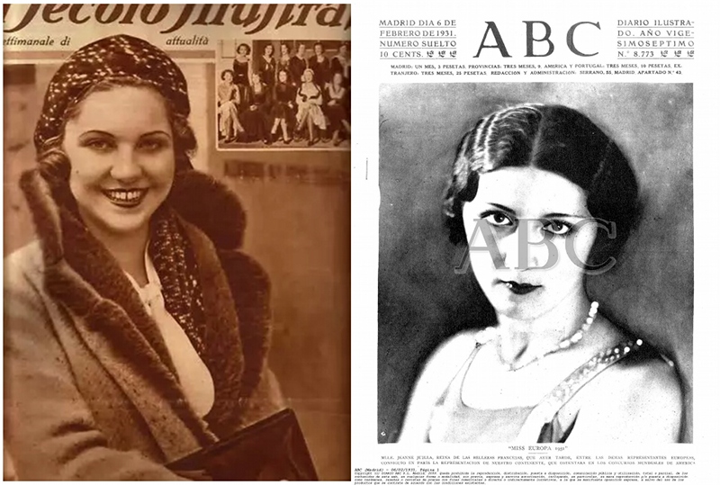 Слева: первая страница журнала «Secolo Illustrato», № 7, 1931. В верхней части изображения: коллективная фотография участниц конкурса. Справа: первая страница иллюстрированного еженедельника «ABC», Мадрид, 6.02.1931. Эта же фотография (без логотипа) имеется в [9]. Рисунок 3. Жюли Жанна Жюйя, «Мисс Европа-1931», Франция Журнал «Тайм», понедельник, 16 февраля 1931 года [10]. «Зарубежные новости: Жюли Жанна Жюйя «Мисс Европа – 1931». На прошлой неделе, в Париже, шестнадцать молодых женщин из разных европейских стран предстали перед жюри художников под председательством живописца Поля Шаба (Paul Chabas), автора знаменитой картины-ню «Сентябрьское утро» 3. «Мисс Европа» была избрана 19-летняя Жюли Жанна Жюйя из Вильнёв в Гаскони. Красавица с сине-зелеными глазами и черными, как уголь волосами также будет участвовать в конкурсе на звание «мисс Вселенная» в Сантьяго, Чили. Жюли Жанна подарила репортерам следующую очаровательную гасконаду: «Моя самая большая амбиция – сделать мать счастливой. Я не собираюсь идти на сцену или экран»… Вместо многоточия, в статье «Мисс Мира и Мисс Европа в 1930е годы» [14], со ссылкой на тот же источник (журнал «Тайм» от 16.02.1931), приводится еще одна, следующая фраза интервью Жанны Жюйя: «Всего несколько недель назад я впервые увидела большой город, Париж!» Польская газета «Иллюстрированный ежедневный курьер» [15] подробно информировала своих читателей о конкурсных перипетиях. 7 февраля она поместила фотографии большинства участниц конкурса и небольшую заметку, в которой отметила, что перед жюри стоит непростая задача выбрать лучшую среди достойных. А 9 февраля напечатала эксклюзивный материал собственного корреспондента «Как «Мисс Франция» стала «Мисс Европа». Помимо председателя (Поль Шаба) и организатора конкурса (Морис де Валев), которые представляли Францию, в состав жюри входили представители от каждой страны-участницы конкурса. Больщей частью, это были художники. Итоги конкурса были оглашены 6 февраля при большом скоплении парижан, которые ожидали принятия окончательного решения «с большим напряжением, чем образование нового кабинета». Сообщение о присуждении титула «Мисс Европа-1931» француженке Жанне Жюйя было встречено с ликованием. В заключение, «Мисс Европа-1931» дала короткое интервью. Она «говорила тихим голосом, и было заметно, что ошеломлена своим успехом». Очень женственная «смуглая шатенка с сапфировыми глазами» поведала журналистам, что «вначале была избрана мисс Гасконь, и это побудило ее к участию в конкурсе «Мисс Франция», хотя она и не верила в возможность успеха». «Происходит из весьма скромной семьи, которая имеет небольшую швейную мастерскую. Обожествляет танцы, любит спорт и, прежде всего, плавание... Любит веселые театральные представления и танцевальную музыку. Какие планы на будущее? — Нет помыслов о театре или кино, скорее вернусь к своей профессии. Как мы убедились, у «Мисс Европа» нет каких-либо особых увлечений и предпочтений. Между тем было видно, что она утомлена и следовало оставить ее в покое. Молодая королева распрощалась со всеми. Ей завтра отправляться на Ривьеру, а через пару месяцев она должна будет проявить волю, участвуя в общем сражении за титул «Мисс Вселенная». Газета «Brooklyn NY Daily Star», 24 февраля 1931 года [16]. «Ривьера приветствует Королеву красоты. Тысячи посетителей Канн, Франция, во время недавней 