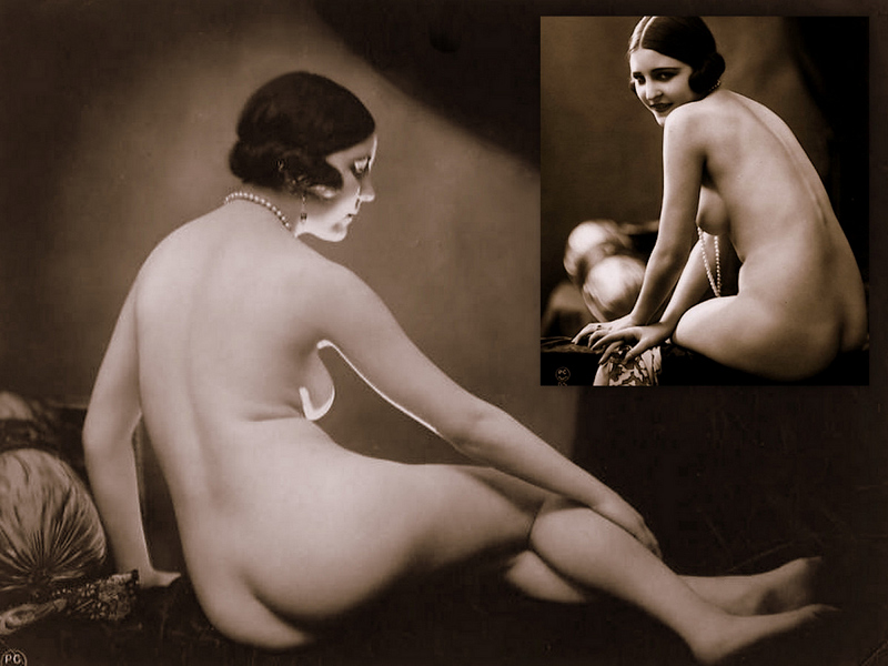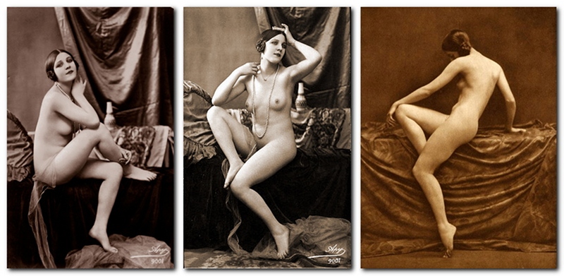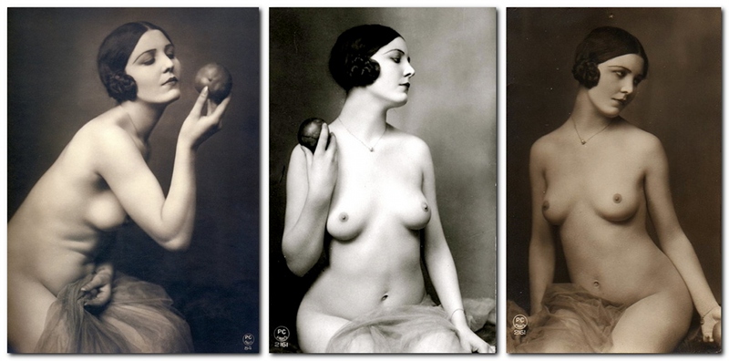 Рисунок 16. Слева и в центре: фотографии (открытки) студии «APY». Модель — Жанна Жюйя. Справа: фотография Станислава Джулиана Игнатия, графа Остророга, из альбома «Обнаженные. Сто оригинальных фотографий Laryew», изданного в 1923 году. Под фотографиями, показанными на рис. 16 (справа и в центре) все тот же «собиратель» пишет: [на фотографиях] «малоизвестной студии «APY» Жанна Жюйя с привычной [характерной] прической. Просто по стилю, я подозреваю, что фотографом, возможно, был Жан Ажелу (Jean Agelou)». Очевидно блогеру невдомек, что братья-фотографы Жан и Жорж Ажелу погибли в 1921 году в автокатастрофе, и что в этом году Жанне Жюйя было всего 9-10 лет. Стоит ли рыскать по Всемирной сети и копировать чужие фотографии, чтобы морочить голову людям и выставлять напоказ свое невежество. Ведь блогер, натащив себе фотографий (показаны на рис. 16, 17), даже не смог узреть, что на фотографиях студии «APY» ряд предметов, окружающих модель, тот же, что и на фотографиях студии «PC Paris». Вероятнее всего, съемка была сделана в одной из студий («PC Paris» или «APY»), а затем распечатана этими студиями «на взаимовыгодных экономических условиях». Такое предположение вовсе не выдумка. Хотя это и выходит за рамки обсуждаемой темы, можно показать (и не на одном примере), что студии «делились» негативами. Модель — та же, сюжетный мотив — тот же, но на открытках стоят логотипы разных студий. На каких условиях делились негативы и прибыль — это уже другой вопрос.