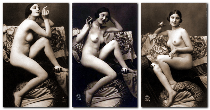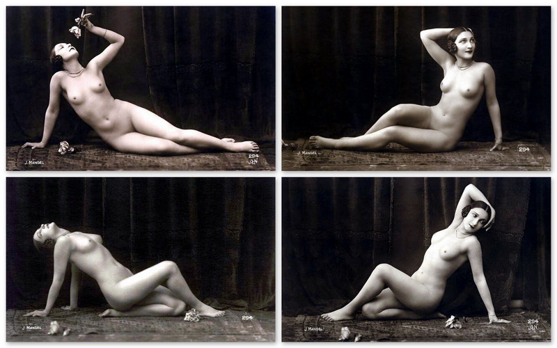 Рисунок 11. Фотографии (открытки) студии «PC Paris». Фотомодель — Жанна Жюйя Головоломка под названием «Старые эротические фотографии» Общеизвестно, что идентификация старых фотографий затруднительна. Но выяснение времени создания и авторства (фотограф? фотомодель?) старых эротических фотографий представляет настоящую головоломку. В небольшой, но весьма интересной книге «Магнаты индустрии. Коммерческая фотография в Париже, 1848-1871» Э. А. МакКоулей [45] рассматривает вопрос, что означало быть коммерческим фотографом в Париже, в конце 19 века и, в частности, заниматься изготовлением эротических фотографий. Деятельность студий, изготовлявших открытки-фотографии в стиле ню, находилась под неусыпным надзором полиции, ревностно следившей за тем, чтобы фотографы «не слишком углублялись в тему». В свою очередь, фотографами были выработаны методы, позволявшие противостоять натиску цензуры [45]: «Нанимая посредников для распечатки негативов, ручного раскрашивания и монтажа изображений, предприимчивые порнографы могли получать максимальную прибыль от ограниченного числа контактов [фотосессий, съемок] с обнаженной моделью, скрывая свое производство от полиции. [Из-за] трудностей определения фотографического стиля, разделения труда и использования одной и той же модели разными фотографами, определение уголовной ответственности за изготовление порнографических фотографий становилось почти невозможным...» Анализируемый в [45] материал относится к 50-70 годам 19 ст. К 1930 году (за последующие 60-80 лет) методы противостояния были доведены до совершенства. Подборка эротических фотографий Жанны Жюйя тому свидетельство. В ней есть все, о чем говорится в цитате: