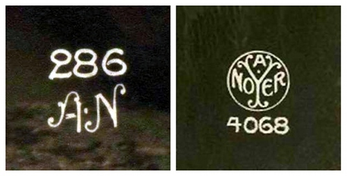 Рисунок 15. Логотип (маркировка) фотографий (открыток) «Alfred Noyer Studio». Слева: ранняя (1920-23 г.г.), справа: поздняя (1924-29 г.г.), для продукции Джулиана Манделя. Но и это не предел! В «коллекции» под названием «Reality Asylum» есть фотография (рис. 16, справа) с правильно указанными авторством и датой: Walery, Nu, 1923. Но «собирателю коллекции» под названием «The Venusberg» [53] этого мало. Скопировав фотографию в свою «коллекцию», он добавляет: «эта модель — Жанна Жюйя». На самом деле, это фотография из альбома: «Обнаженные. Сто оригинальных фотографий Laryew. Библиотека декоративного искусства», изданного в 1923 году (издатель В. Calavas) [54]. Альбом содержит 100 репродукций фотографий уже упоминавшегося Станислава Джулиана Игнатия, графа Остророга, который на этот раз вместо псевдонима Walery, воспользовался псевдонимом Laryew (см. сноску 13) и, по-старинке, назвал свои фотографии «гелиогравюрами» 15.